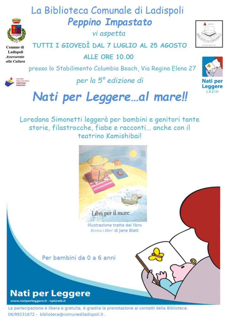La Biblioteca comunale di Ladispoli “Peppino Impastato” propone l’iniziativa, arrivata alla sua 5^ edizione, NATI PER LEGGERE …AL MARE!,letture a bassa voce e teatrino Kamishibai per bambini e genitori. Vi aspettiamo, insieme alla volontaria NPL Loredana Simonetti, tutti i giovedì dal 7 luglio al 25 agosto alle ore 10.00, presso lo Stabilimento Columbia Beach, in