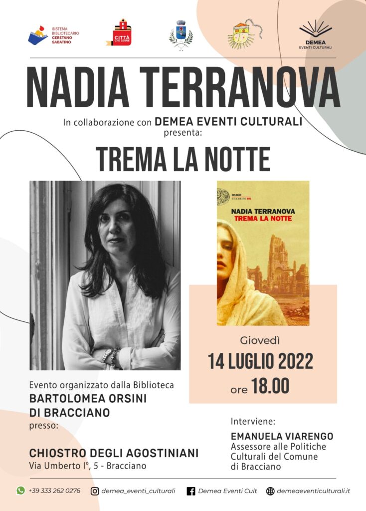 La Biblioteca comunale di Bracciano vi invita giovedì 14 luglio alle ore 18:00 presso il Chiostro degli Agostiniani per la presentazione del libro “Trema la notte” di Nadia Terranova. Non mancate!!! Prenotazioni al n. 06/99816267 email: biblioteca@comune.bracciano.rm.it