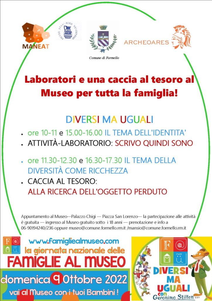 Anche quest’anno il Museo dell’Agro Veientano di Formello aderisce a F@MU 2022- Giornata Nazionale delle Famiglie al Museo. Vi aspettiamo domenica 9 ottobre per condividere le nostre attività con tutti voi, adulti, bambini! Età dai 4 ai 12+ anni Info e prenotazioni: 06-90194240/236 oppure museo@comune.formello.rm.it/mansio@comune.formello.rm.it“
